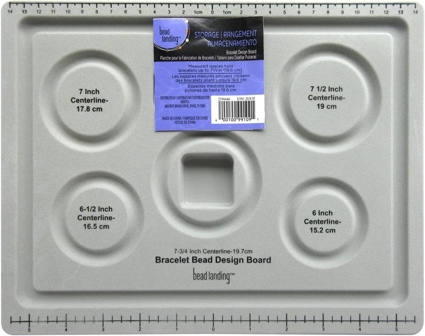Lay out five bracelets at one time! This compact bracelet bead board has a continuous channel along the edge to use to design necklaces, and two cutout compartments to store loose beads. Use the measurements along the edge to cut your jewelry wire to the length you need.Details Gray bead design board Make 5 bracelet lengths: 6" to 7.75"12 design boards Textured surface keeps beads from rolling Recessed compartments store extra beads
