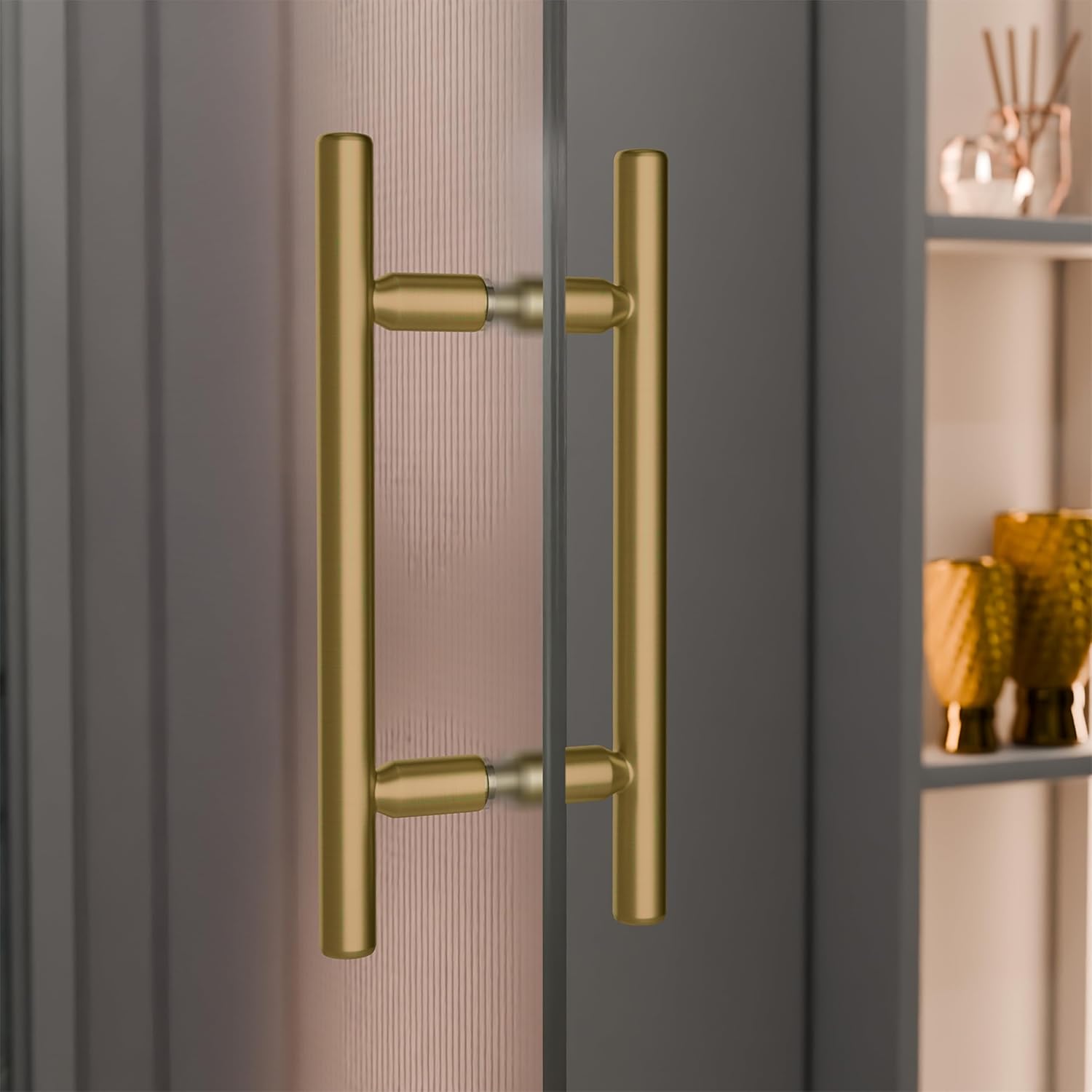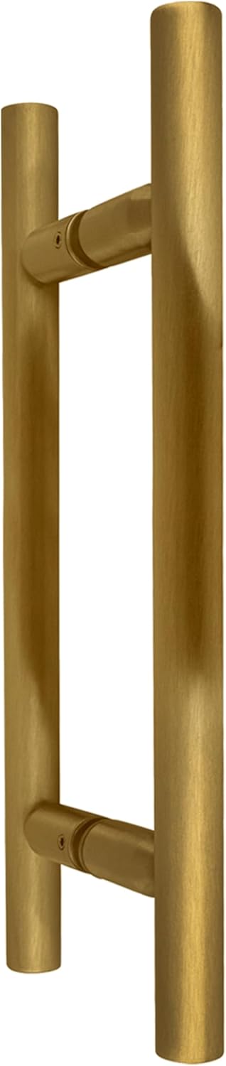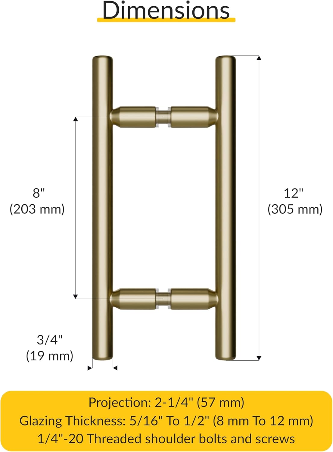 The Brixwell ladder style back-to-back pull handle is made of stainless steel and has a brushed bronze finish. It features a tubular squared design with a 3/4" diameter, providing a clean grip surface for glass doors. The handle has an overall length of 12" with a mounting center-to-center spacing of 8". It is designed to mount back-to-back on glass doors using through-glass fasteners. Suitable for tempered glass panels with a glazing thickness between 5/16" and 1/2", this handle fits door styles that open by sliding, swinging, folding, or pivoting. Its application includes corner, niche, bathtub, or custom-made glass enclosures, and it can be used as a shower door handle, glass door pull, or entry pull in various residential or commercial setups. This handle is compatible with both sliding shower doors and fixed panel installations that require a back-to-back grip. Its brushed bronze finish helps it blend in with various decor themes while offering a functional grip. The mounting method allows it to be secured directly onto glass without a frame, making it suitable for frameless shower doors or custom entry areas where clean appearance and spacing are required. Comes with two 1/4"-20 threaded shoulder bolts and two set screws for installation, with no metal washers included.