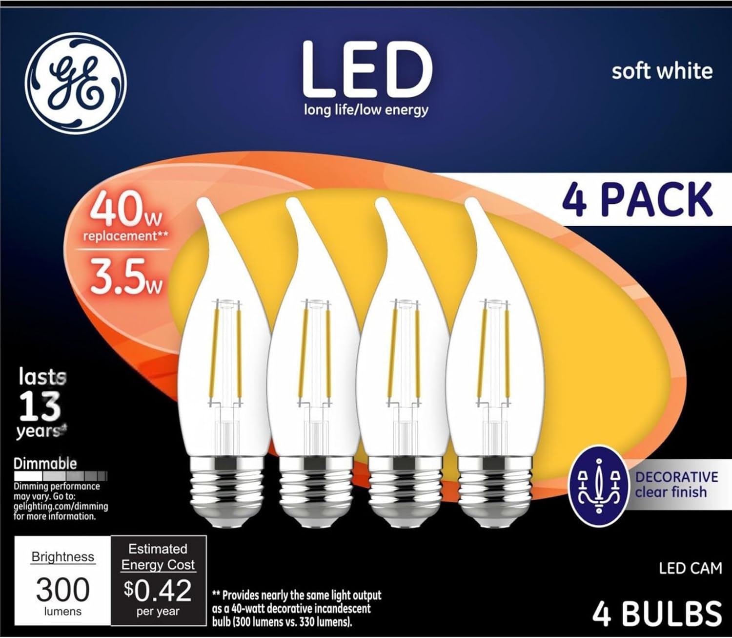 GE’s Soft White LED 40-Watt Replacement Clear Deco light bulb offers outstanding energy efficiency, long-lasting performance and just-right brightness, all in one package. It’s dimmable and illuminates your home with soft, warm light. Use this candelabra-base GE LED decorative bulb in indoor chandeliers, sconces and fixtures where the bulb is visible. Thanks to its aesthetic design, GE’s Soft White LED 40-Watt Replacement Clear Deco light bulb compliments your fixture and adds a decorative touch even when the light is off. When it’s turned on, its long life and low energy use will help you save money on energy.