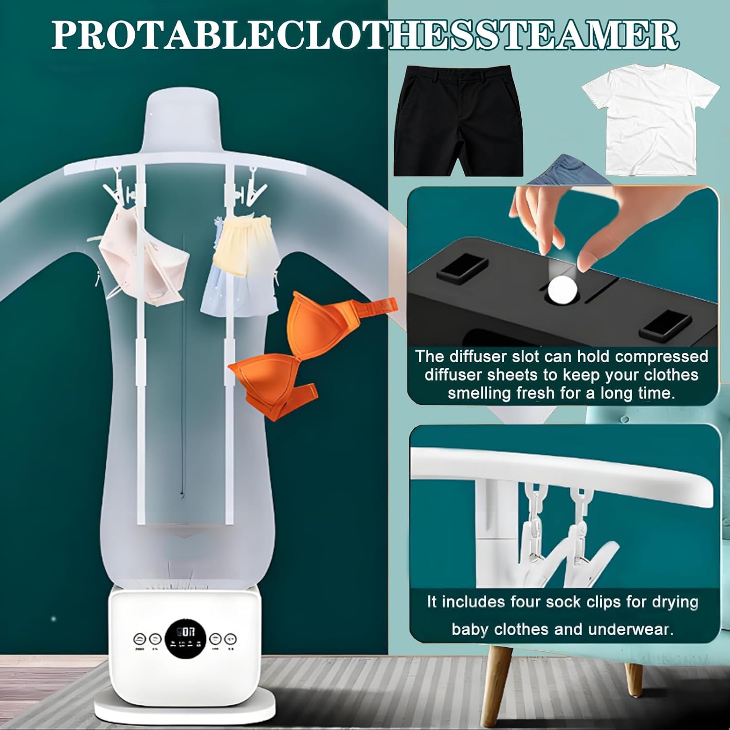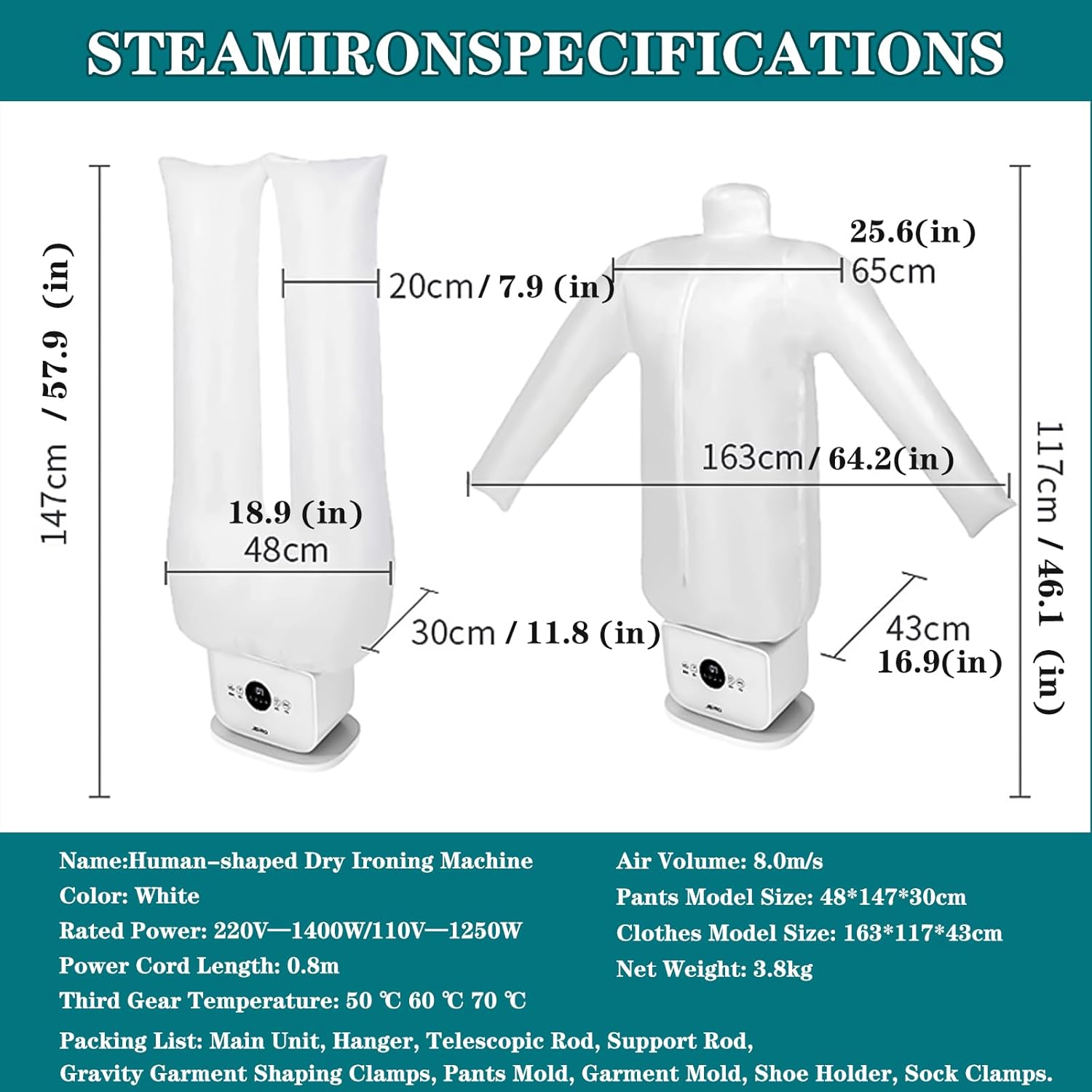 Friendly Tips:For optimal results, the shirt should be damp. We recommend using shirts straight from the washing machine. If you want to iron a dry shirt from the closet, it can be easily moistened with a spray bottle once it is mounted on the machine.These clamps attach to the bottom of the shirt to help avoid creases and wrinkles.If you also want to iron the collar, simply fold it up around the neck of the shirt balloon for a smooth and neat result.For effective performance, correct size adjustment is essential. This is done by extending the telescopic rods and adjusting the side zippers on the shirt balloon to fit your clothes properly.SpecificationsName:Human-shaped Dry Ironing MachineColor: WhiteRated Power: 220V—1400W/110V—1250WPower Cord Length: 0.8mThird Gear Temperature: 50 ℃ 60 ℃ 70 ℃Air Volume: 8.0m/sPants Model Size: 48*147*30cmClothes Model Size: 163*117*43cmNet Weight: 3.8kgPacking List: Main Unit, Hanger, Telescopic Rod, Support Rod, Gravity Garment Shaping Clamps, Pants Mold, Garment Mold, Shoe Holder, Sock Clamps.Notes:1. Due to manual measurement, 2-3cm deviation is allowed.2. Different monitors have different calls, and the product color is subject to the actual product