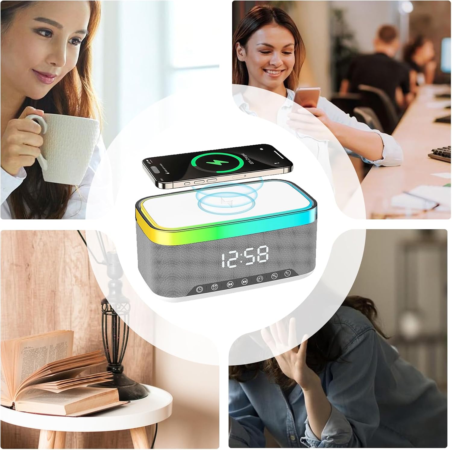 This phone charging alarm clock combines wireless charging, white noise sound machine, and -function digital display, featuring a compact design for bedside or desk use, providing soothing sounds for sleep and relaxation, convenient smartphone charging, and versatile alarm functions for home, office, or nursery environmentsSpecificationProduct Name: alarm clock with wireless chargingProduct color: white, blackProduct size: 18x10x9cm/7.09x3.94x3.54inProduct material: ABSListalarm clock with wireless charging * 1 pieceNote:1. Due to lighting effects and display angles, there may be color differences in the product.2. Due to manual measurement, there may be errors in product size, please understand.
