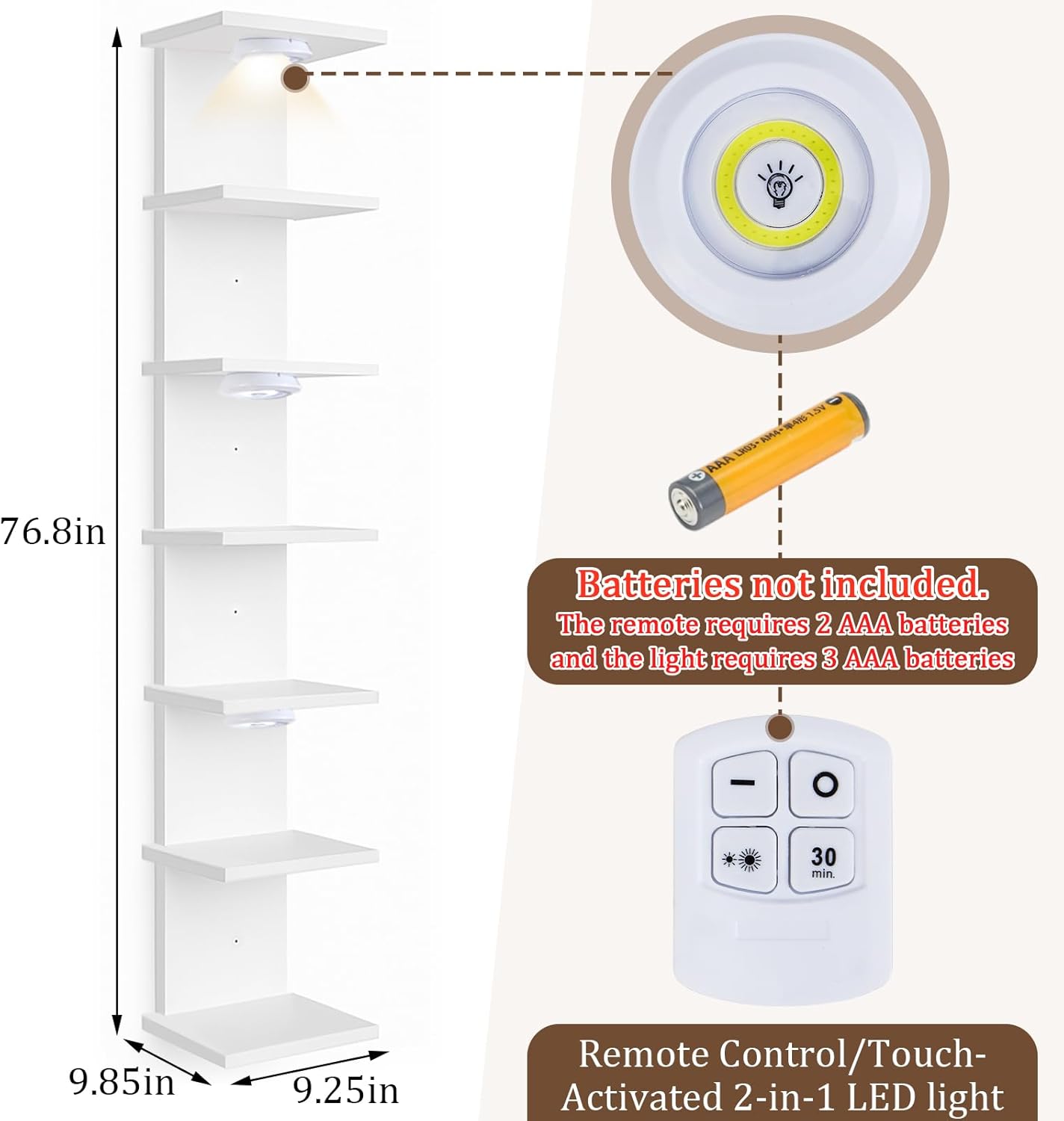 Features: This wall shelf unit white maintains durability while remaining lightweight. The smooth matte finish resists scratches and is easy to clean with a dry cloth. A dependable choice for long-term storage and display needs. The slim profile of this 7 Tier Wall Shelf Unit fits neatly in tight spaces, making it ideal for apartments, dorms, or offices. Its vertical layout maximizes storage without occupying floor space, perfect for optimizing room layouts. Specifications: Color: white Size: about 9.25" x 9.84" x 76.8" Package includes: 2 x 7-tier LED floating wall shelf 1 x Remote Control Notes: Manual measurement, please allow slight errors on size. The color may exist a slight difference due to different screen displays